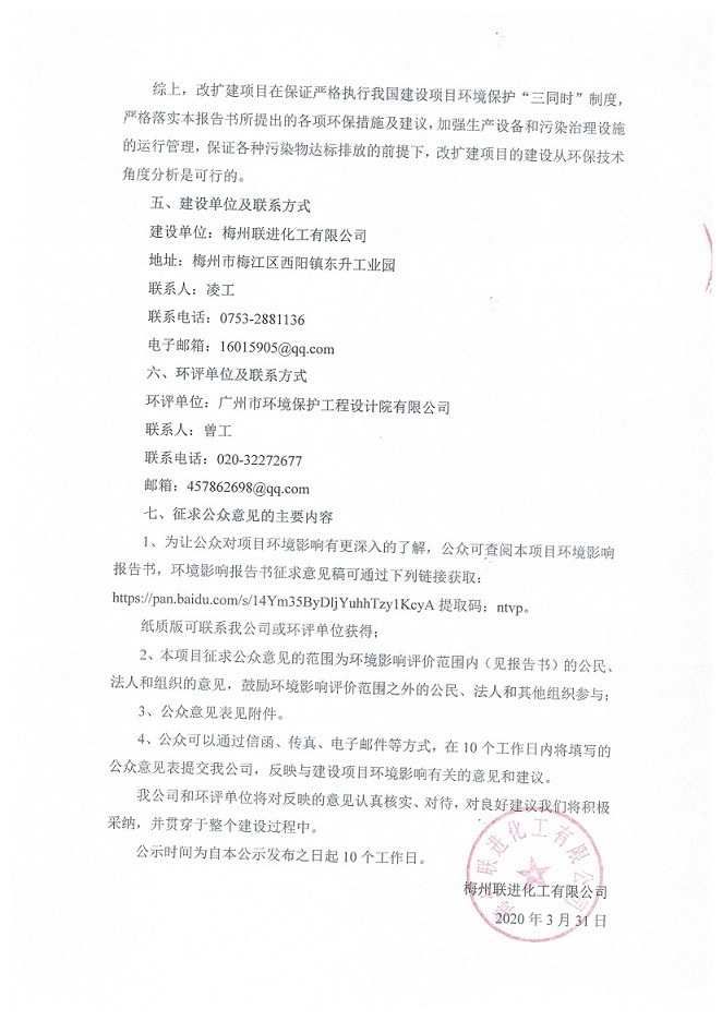 梅州聯(lián)進(jìn)化工有限公司改擴建項目環(huán)境影響評價公眾參與第二次公示